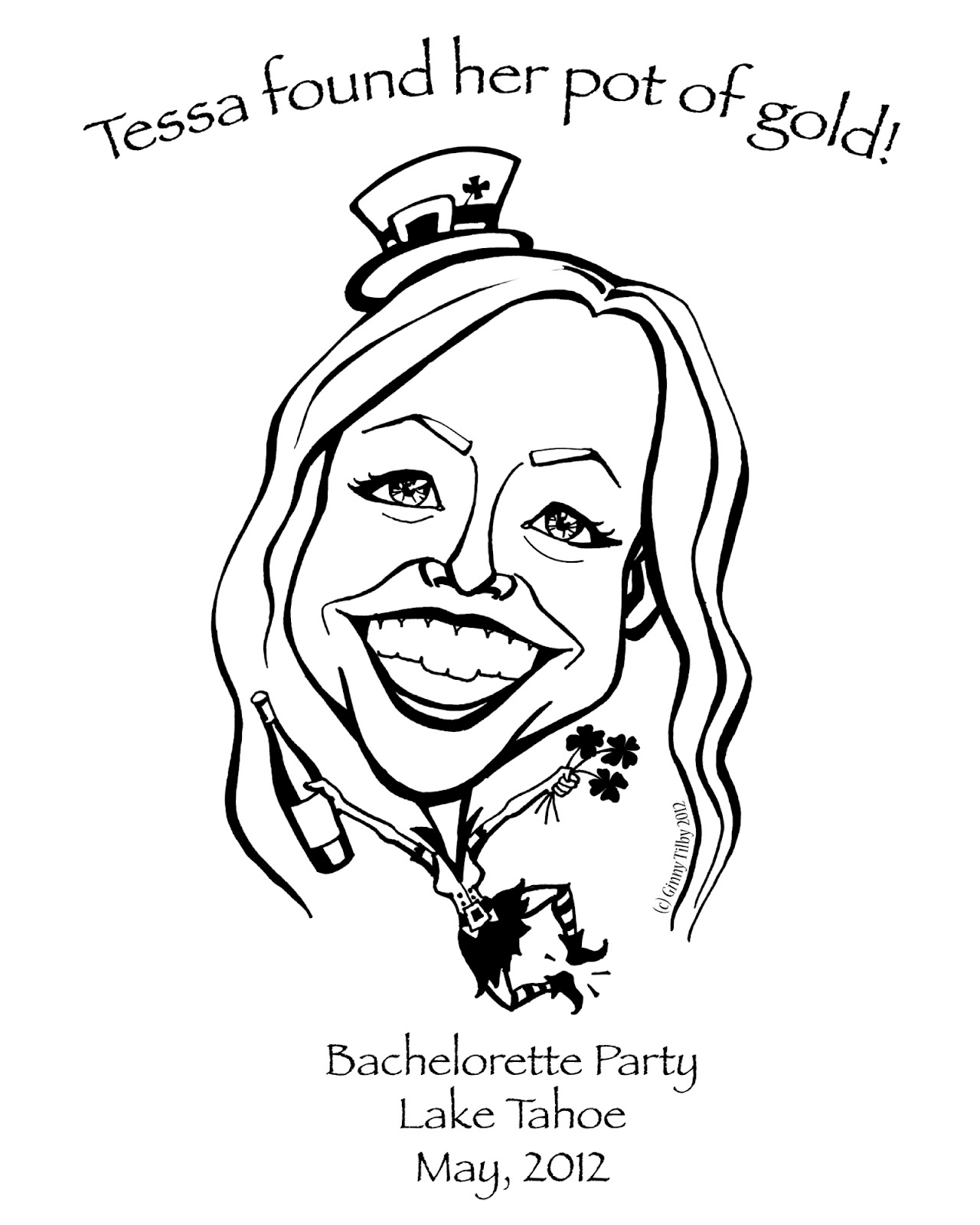 So I'm on vacation right now in Phoenix, it's AWESOME. While here, I got a job doing this caricature. It's for t-shirts for a darling girl's Bachelorette Party. Her friend who commissioned me requested that she become a leprechaun holding chardonnay and shamrocks. It was very fun to work on! Thought I'd share!